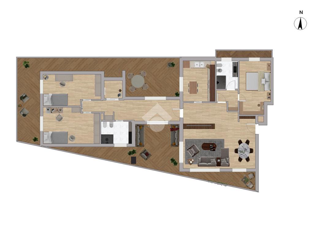 L'appartamento è caratterizzato da ampi terrazzi privati che lo circondano completamente; un terrazzo è dedicato a zona relax, un altro è ideale per cene all'aperto essendo accessibile anche dalla cucina mentre quello accessibile dalle camere offre un angolo di privacy impagabile.