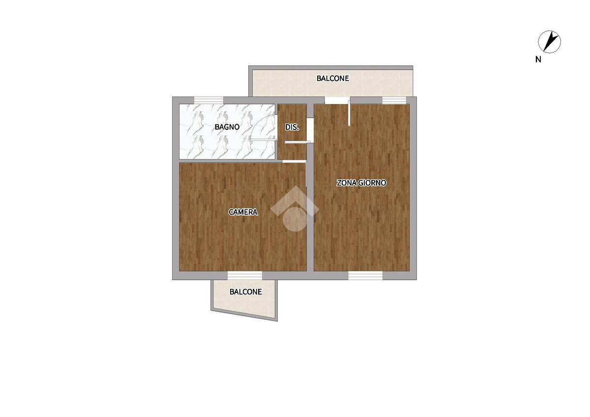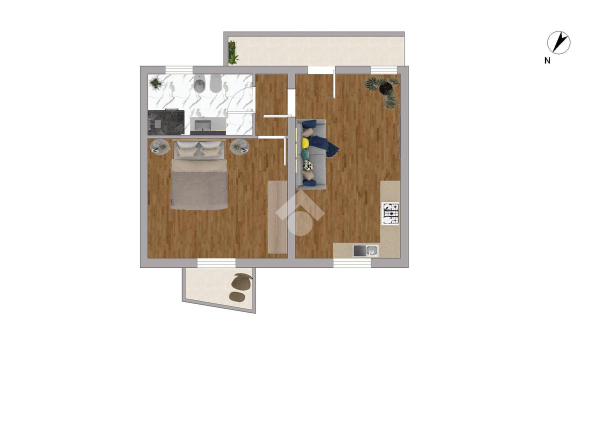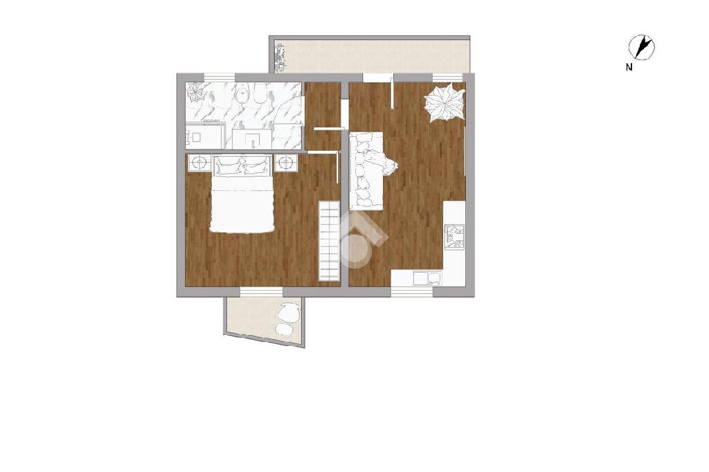Situato al primo piano, questo appartamento è arricchito da un balcone privato che precede l'ingresso e conduce direttamente alla zona giorno. La cucina e il soggiorno si uniscono in un ambiente accogliente, mentre il disimpegno conduce alla camera da letto, che dispone di un secondo balcone, e al bagno completo di doccia.