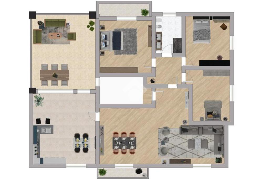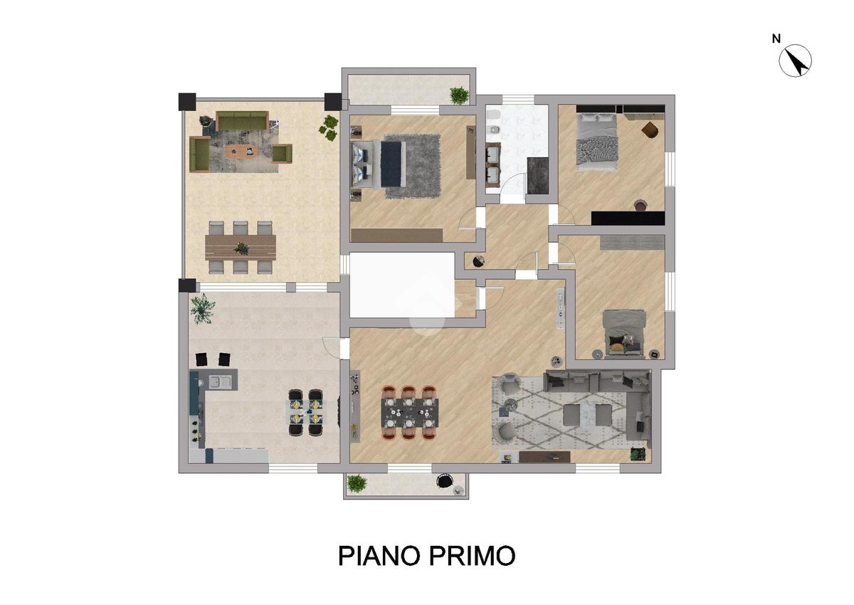 Salendo al primo piano, vi attende una seconda unità abitativa di quattro locali dall'atmosfera spaziosa e ricercata. Un soggiorno doppio accoglie gli ospiti con stile, mentre la cucina e le tre camere offrono spazio e comfort. Un grande terrazzo coperto si presta perfettamente per cene all'aperto e momenti di relax, creando un'oasi privata all'interno della casa.